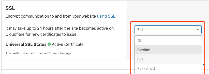 - Flexible: When our origin site is not configured for HTTPS support, enabling this option tells Cloudflare to access our site via HTTP protocol during back-to-origin.