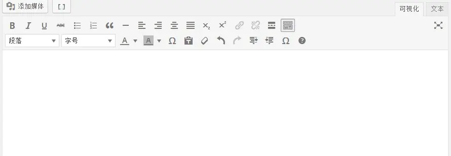 可就是有那么一些用户,喜欢把页面里面的文字搞得五颜六色,形状各异的,这就需要用到编辑中的字号和字体背景等功能。WordPress只是默认隐藏了这些功能,并不是删掉了,并且给我们提供了显示出这些按钮的方法,不能不说WordPress考虑的太周全了。先看一下添加完按钮的效果,注意“**段落**”后面。