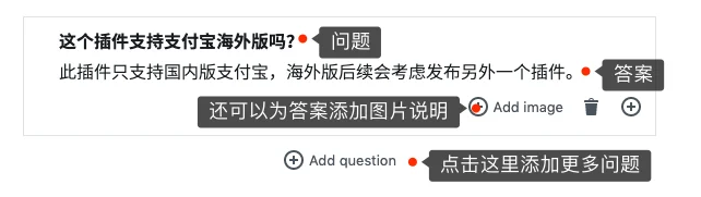 参考下面图片,根据 FAQ 模块的提示添加问题和答案即可。