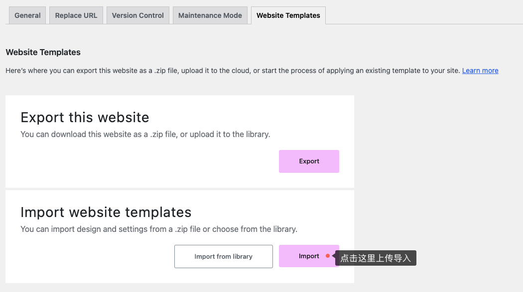 In the WordPress dashboard, open the “Elementor → Tools → Website Templates” page, click the “Import” button, select the template kit zip package we downloaded, and import it after uploading.
